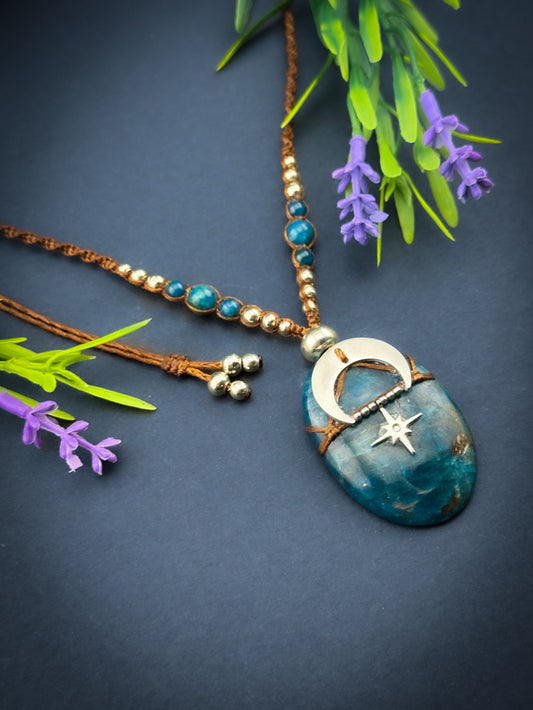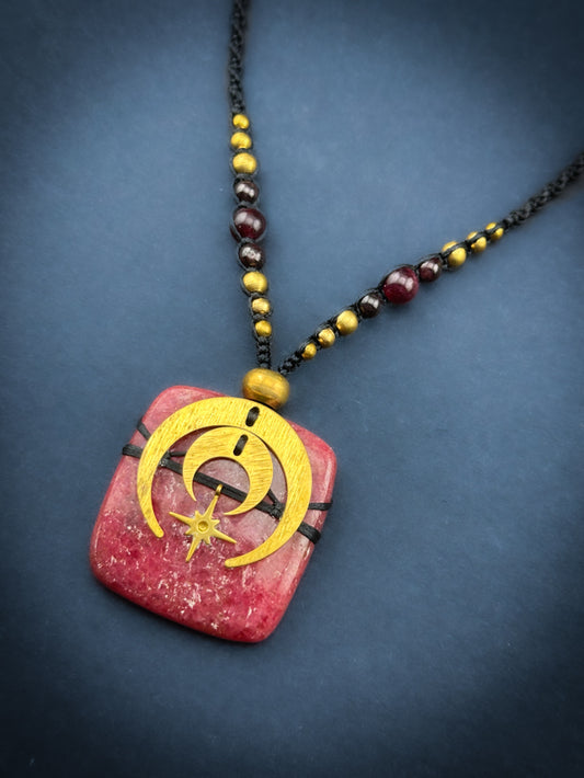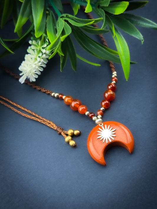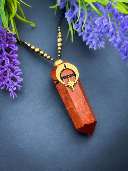 Red Jasper Point with moon & star, Adjustable Crystal Macramé Necklace