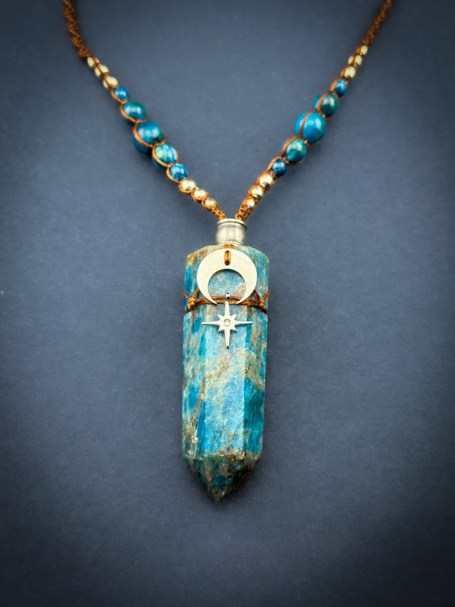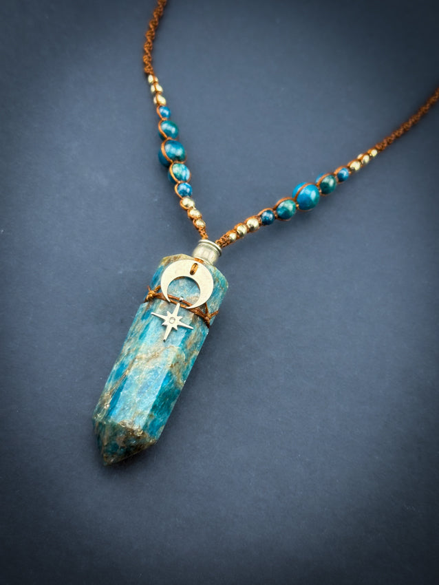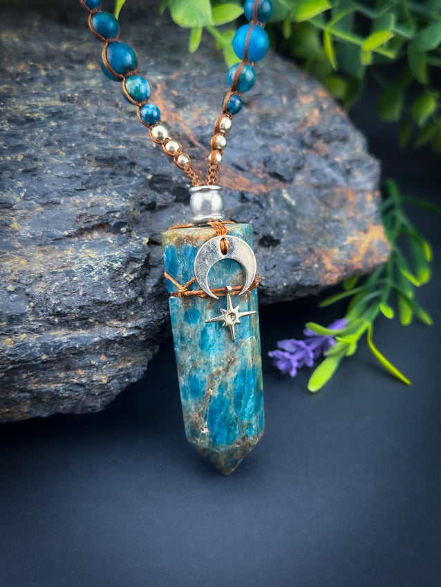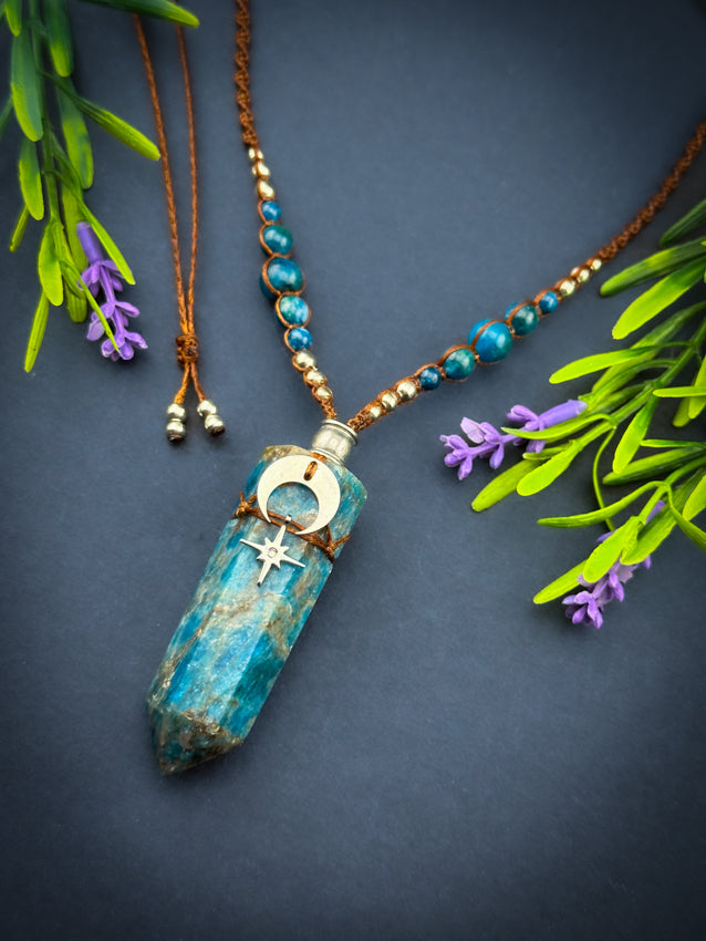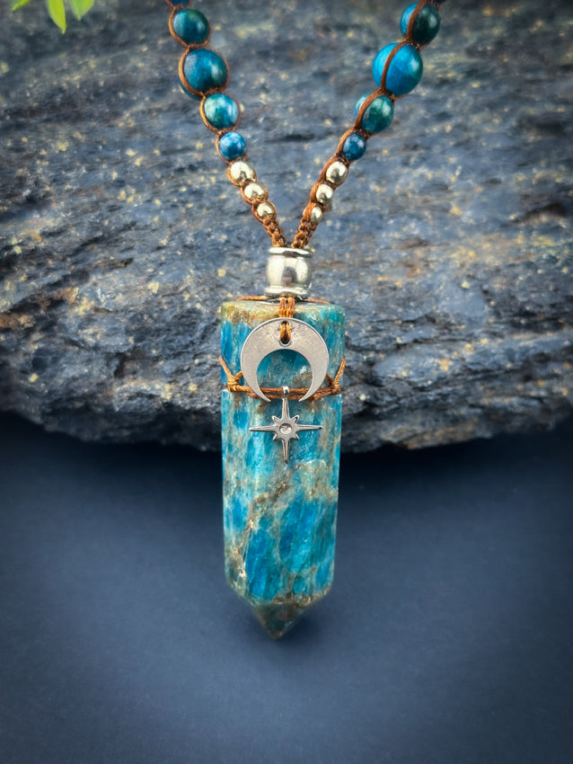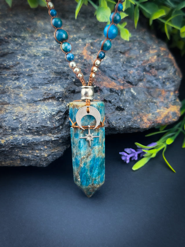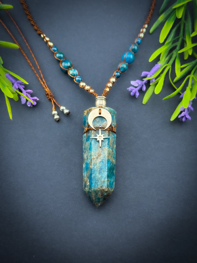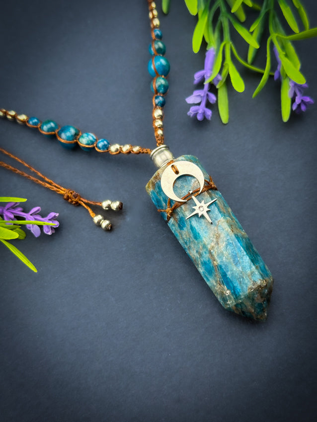 Apatite Crystal Point - Silver Stainless Steel - Adjustable Macrame Necklace