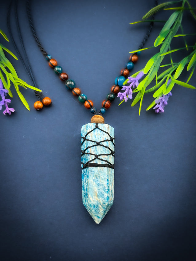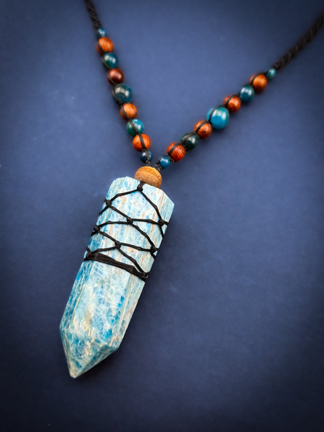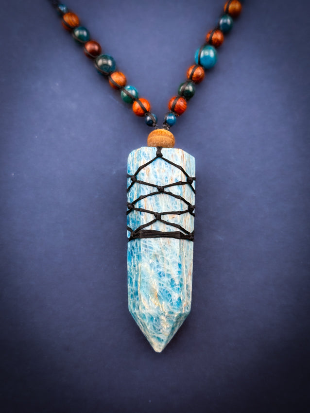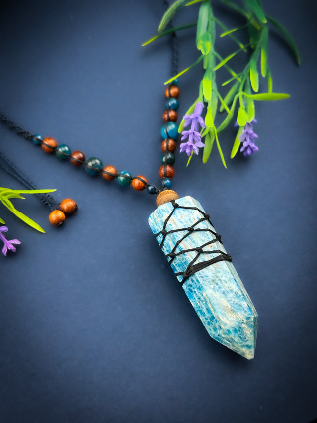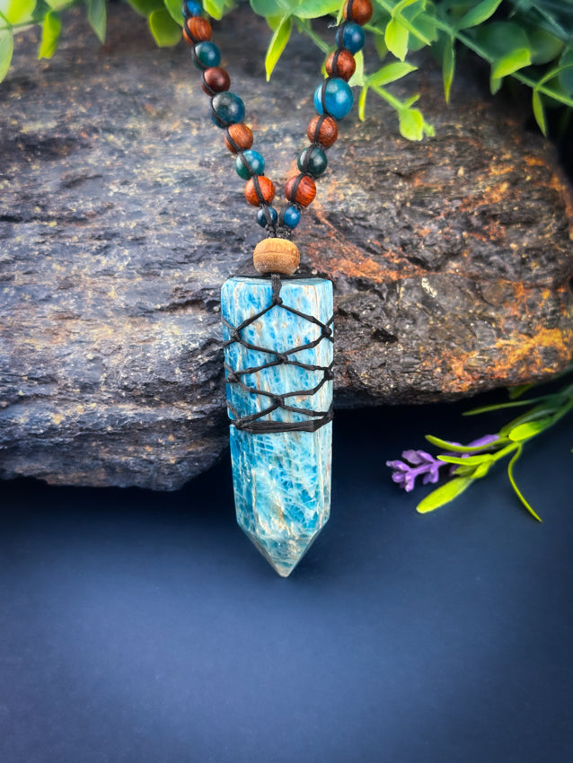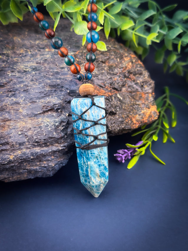 Apatite Crystal Point - Wooden beads - Adjustable Macrame Necklace