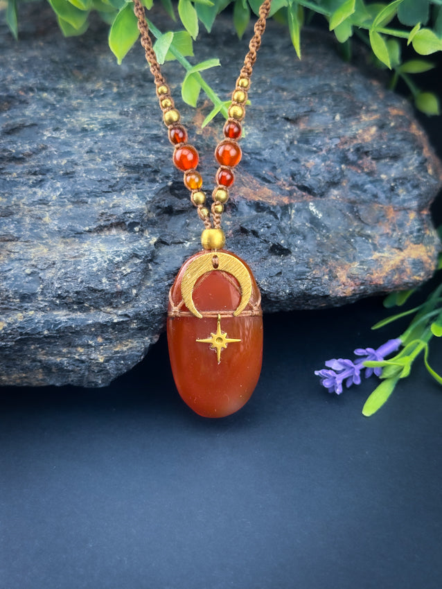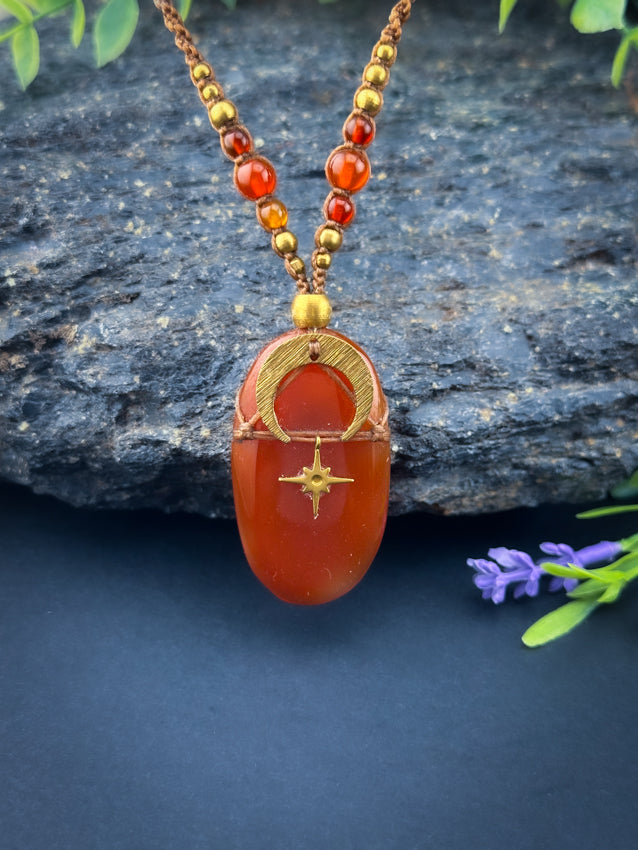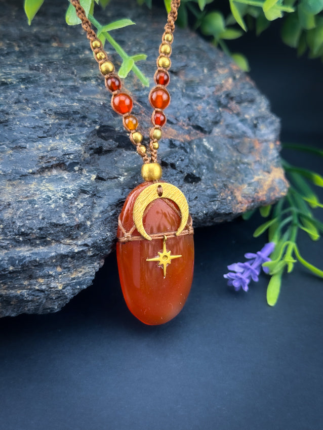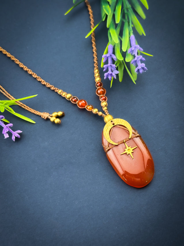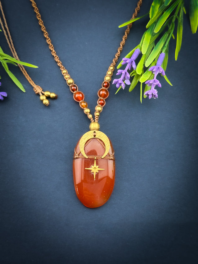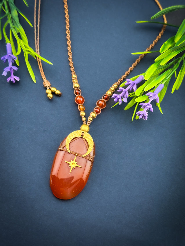 Carnelian Oval - Moon Brass - Adjustable Macrame Necklace