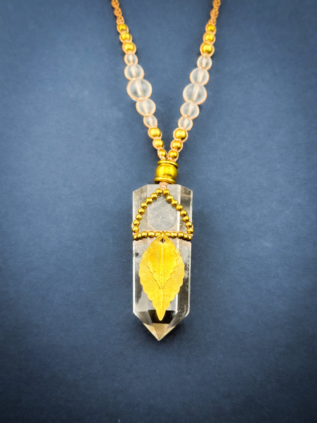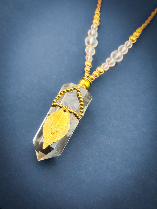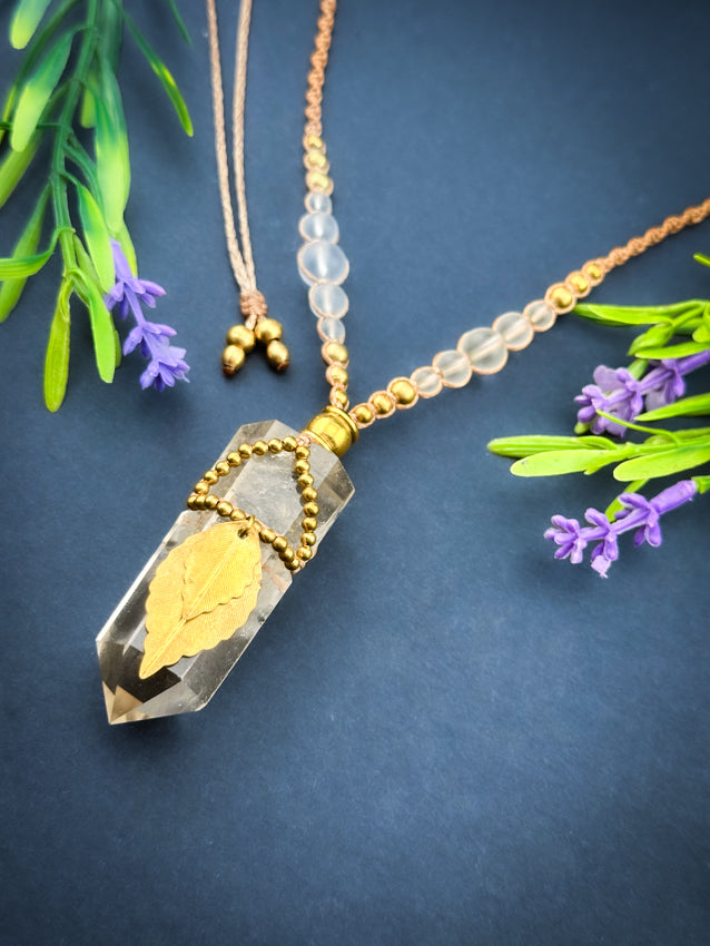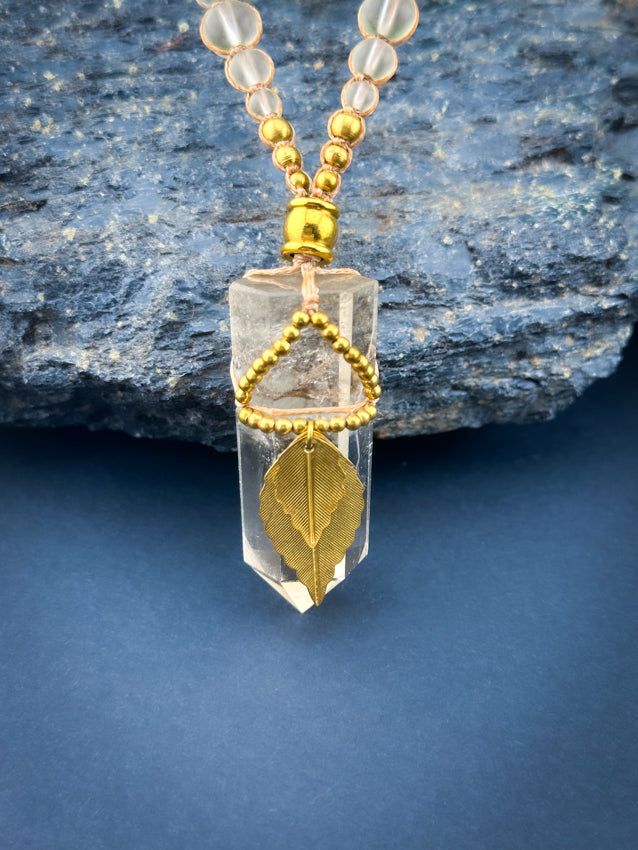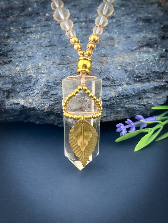 Clear Quart Point - Brass leaves - Adjustable Macrame Necklace