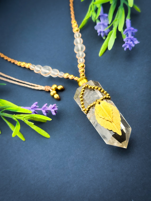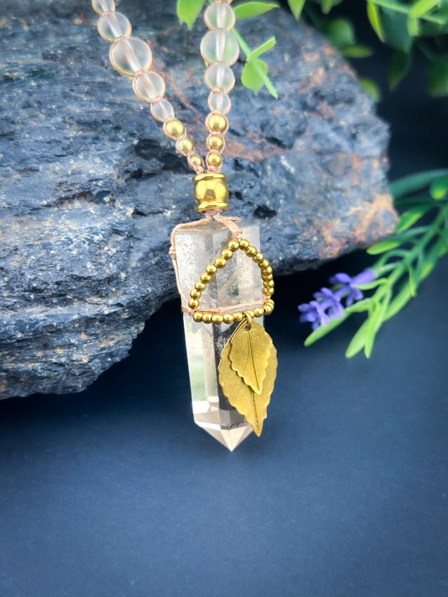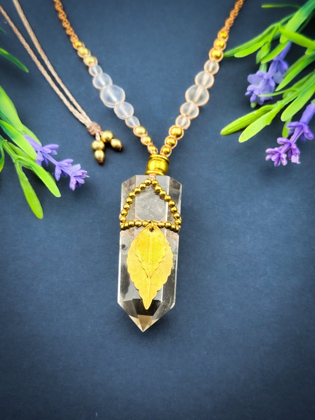 Clear Quartz Point Crystal - Brass Leaves - Adjustable Macrame Necklace