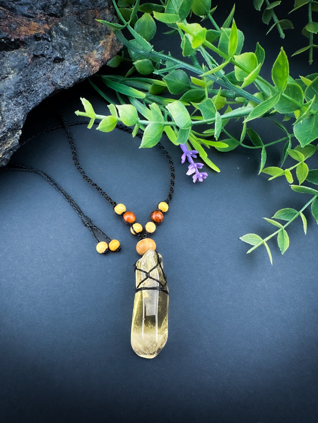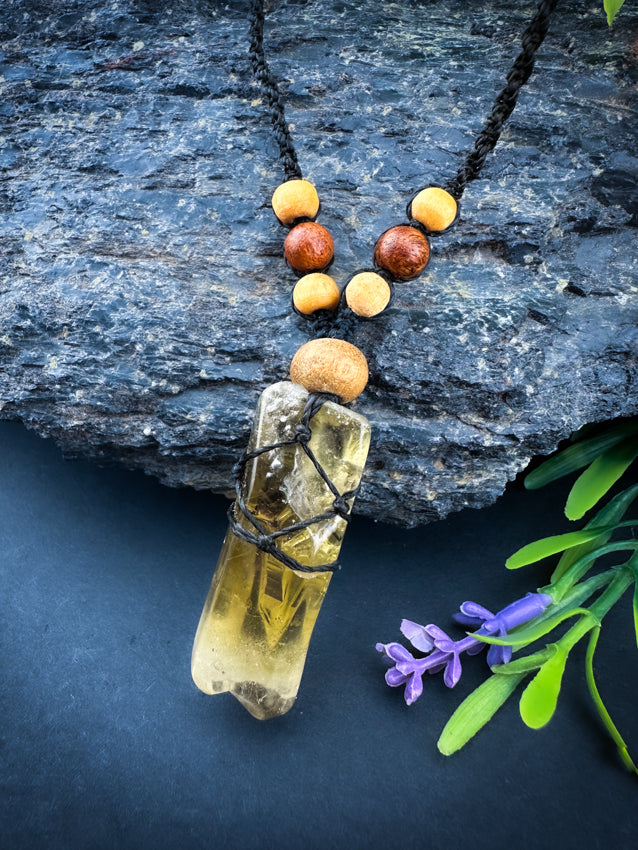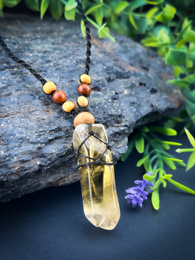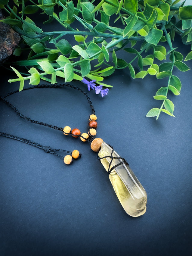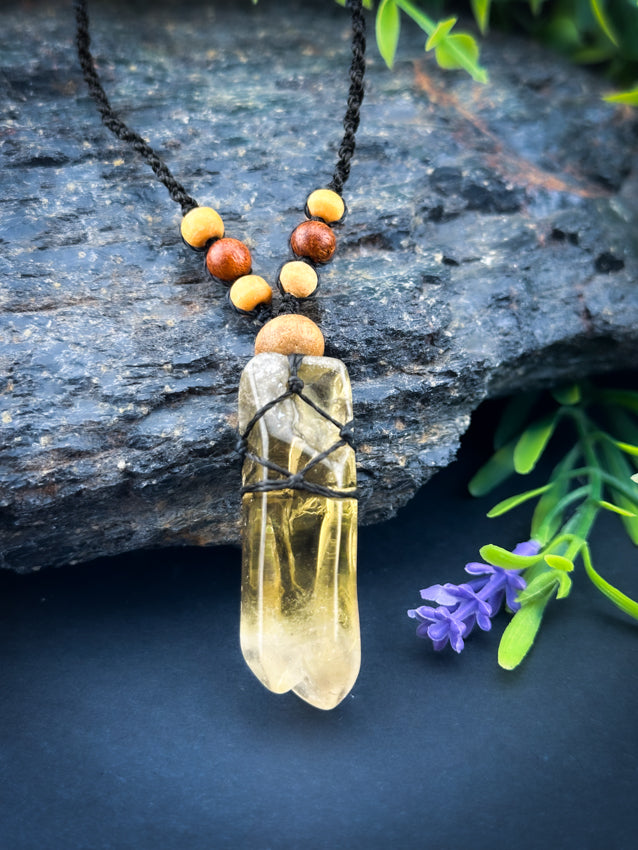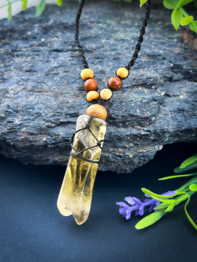 Natural Citrine Point - Wooden Beads - Adjustable Macrame Necklace