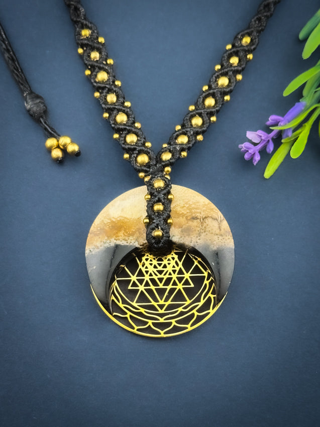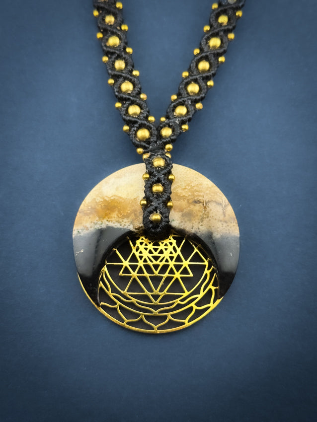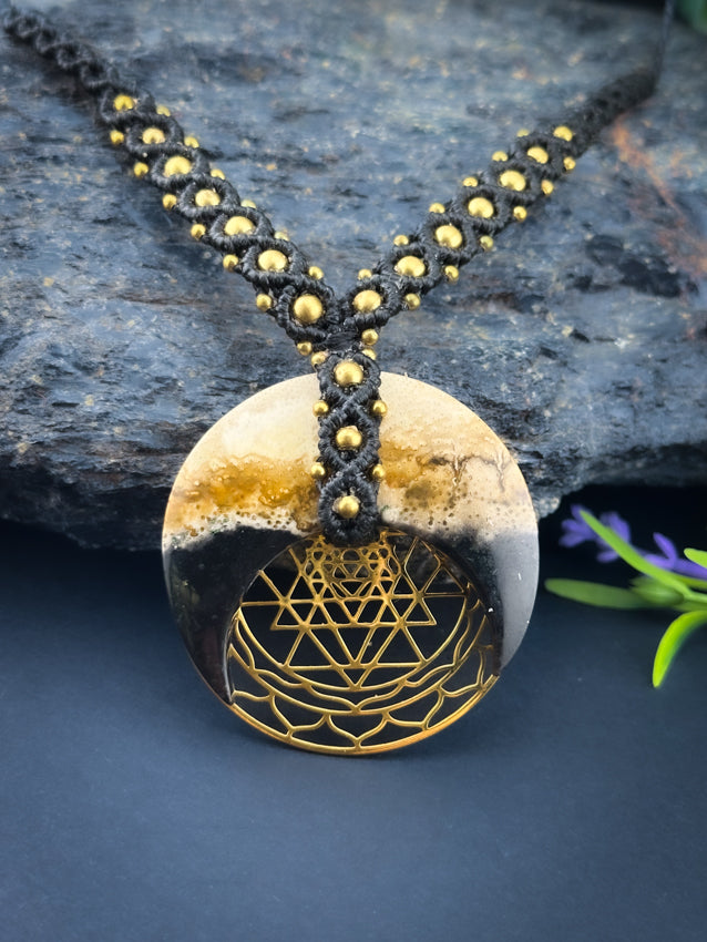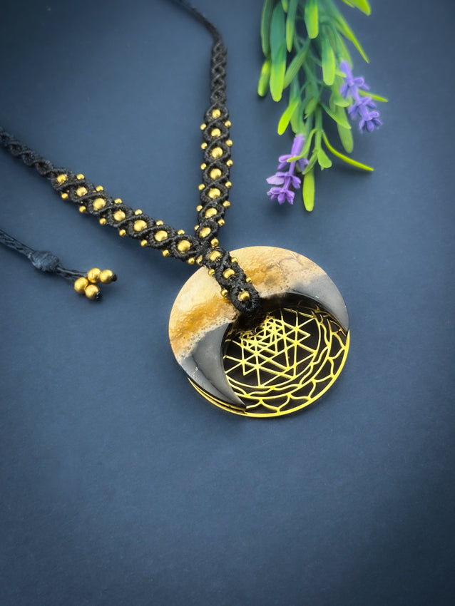 Palm Root Crescent Moon Sri Yantra - Adjustable Macrame Necklace