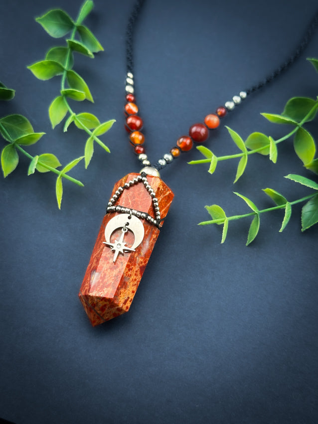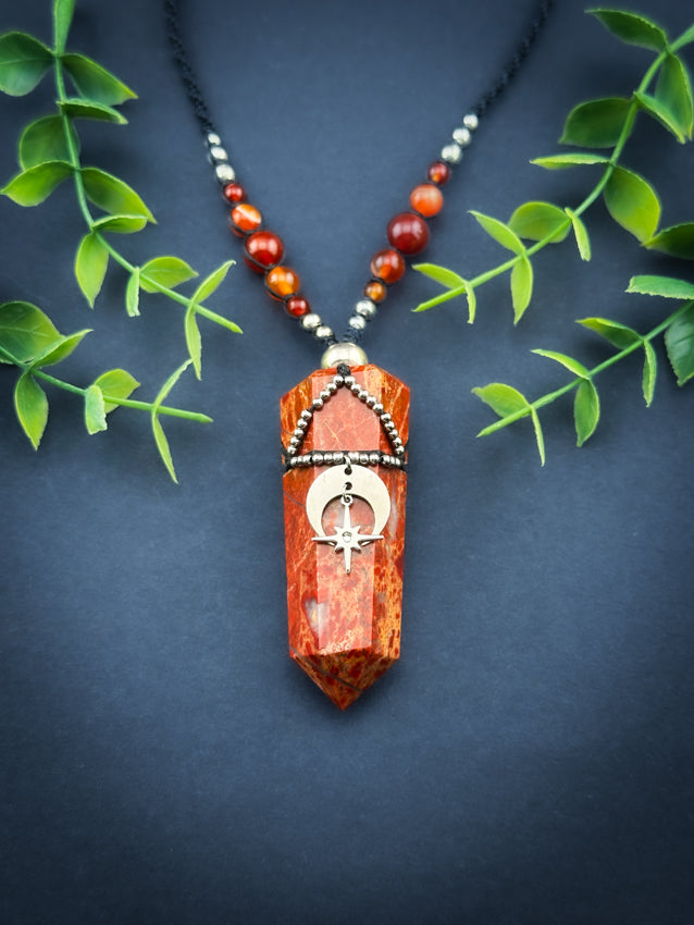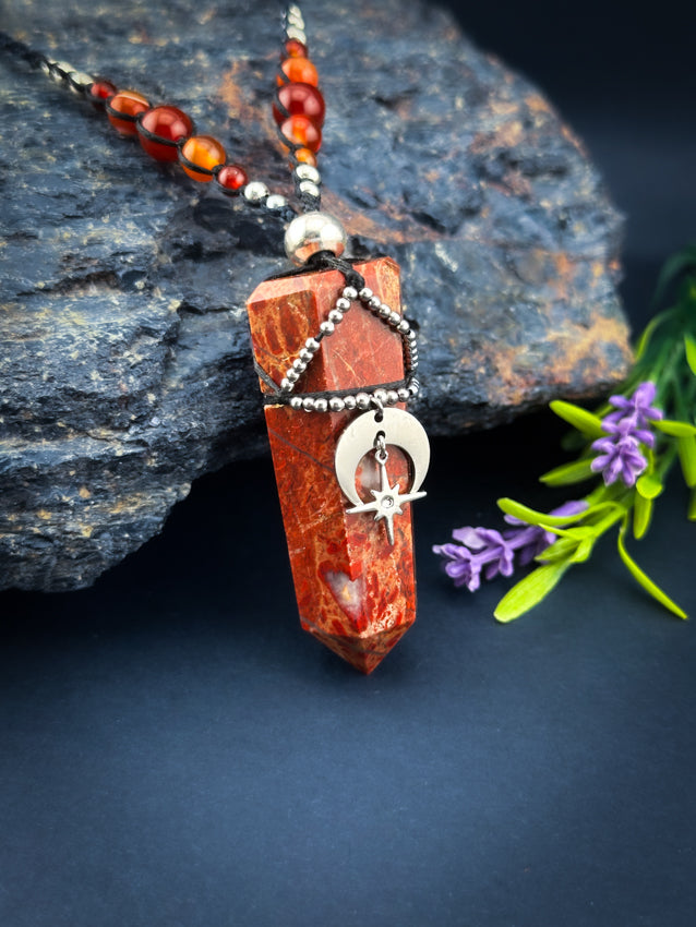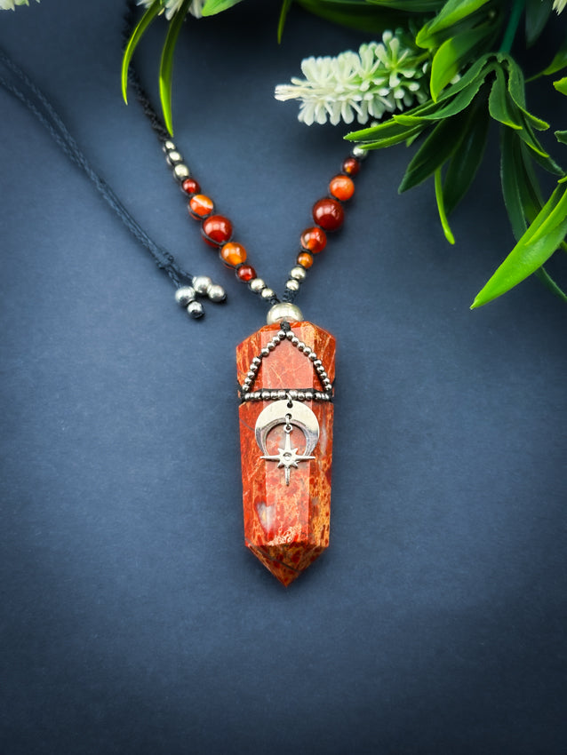 Red Jasper Crystal Point - Stainless Steel Silver - Adjustable Macrame Necklace
